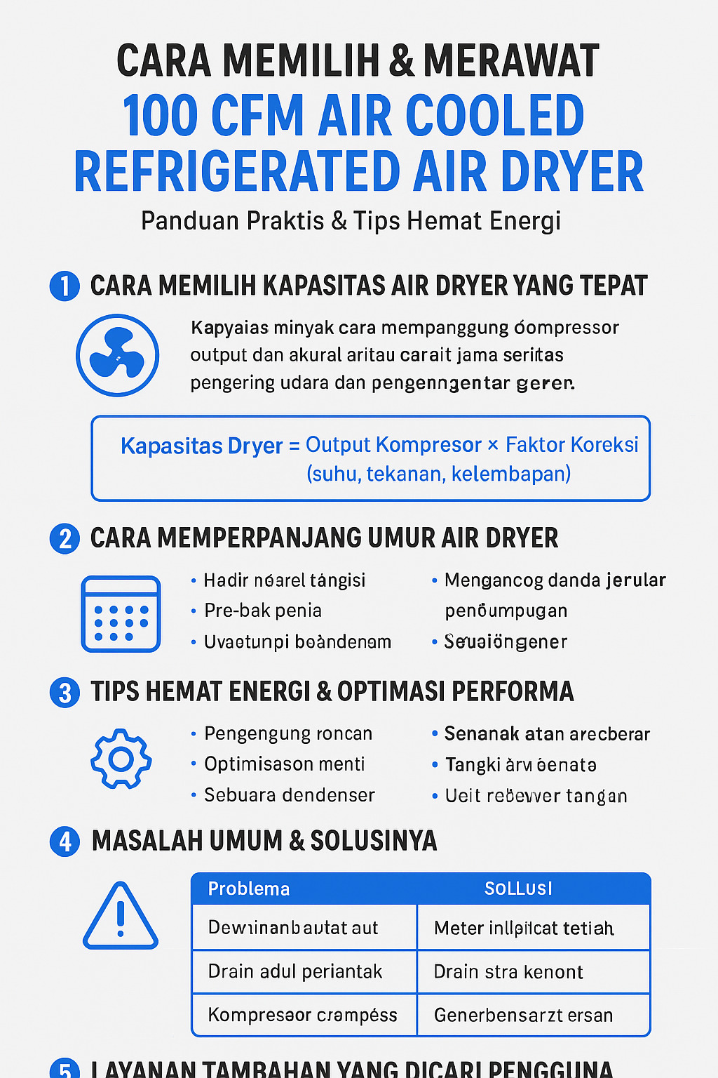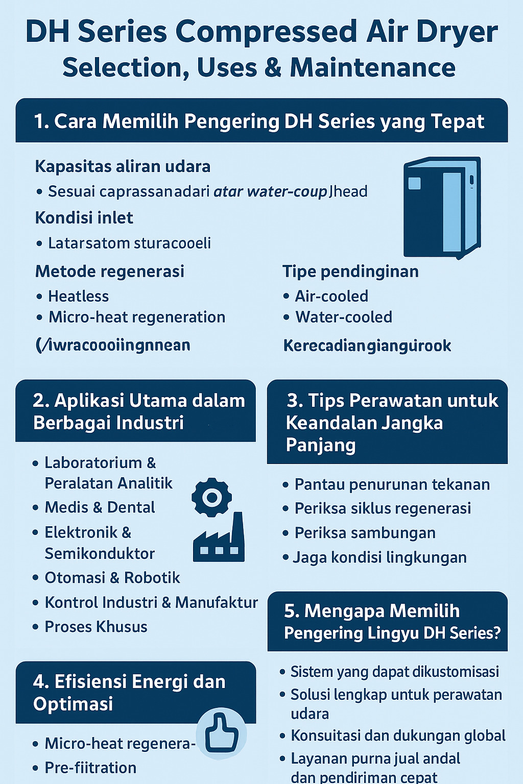Meskipun spesifikasi teknis DH Series Combined Compressed Air Dryer memberikan detail penting—seperti opsi air-cooled atau water-cooled, heatless atau micro-heat regeneration, serta adsorben berkinerja tinggi—banyak pengguna