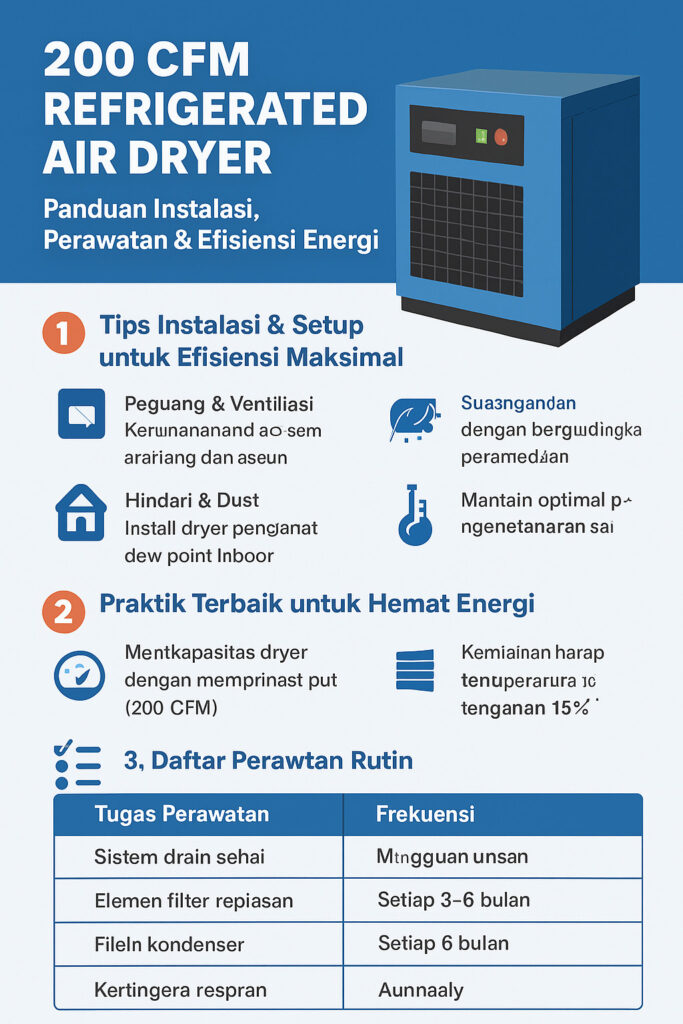 Sesuaikan kapasitas dryer dengan output kompresor: Mengoperasikan di bawah atau di atas kapasitas (200 CFM) dapat memboroskan listrik atau menurunkan kinerja.