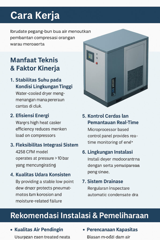 Pengering ini menghilangkan kelembapan dengan mendinginkan udara bertekanan melalui sistem refrigerasi berpendingin air. Uap air yang terkondensasi kemudian dipisahkan dan dibuang secara otomatis, sehingga hanya udara kering dan bersih yang dialirkan ke proses berikutnya.