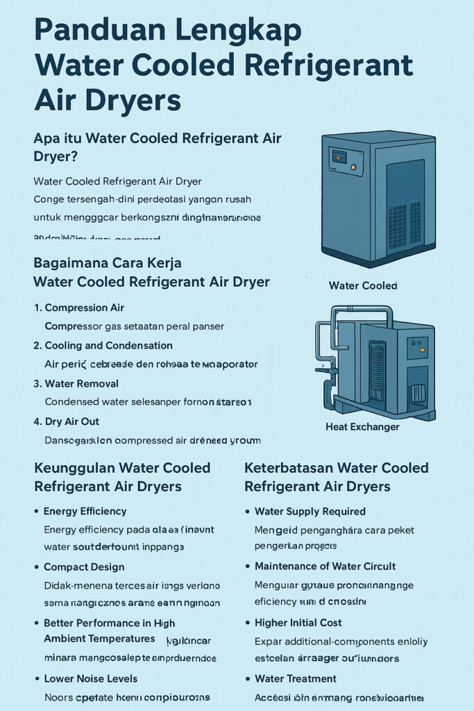 Water Cooled Refrigerant Air Dryers merupakan solusi yang andal dan hemat energi untuk menjaga udara bertekanan tetap bersih dan kering. Unit ini menawarkan kinerja yang konsisten, terutama di lingkungan bersuhu tinggi, dengan keunggulan tambahan berupa kebisingan rendah dan desain yang ringkas. Namun, sistem ini memerlukan suplai air yang stabil serta perawatan rutin agar tetap bekerja optimal.