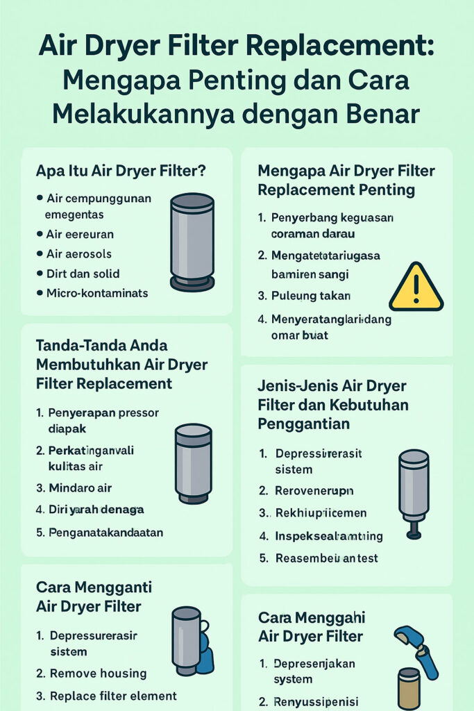 Jika penggantian filter diabaikan, seluruh sistem udara dapat mengalami penurunan kinerja. Dalam artikel ini, Anda akan mempelajari mengapa penggantian air dryer filter itu penting, seberapa sering harus dilakukan, dan tanda-tanda kapan filter perlu diganti.