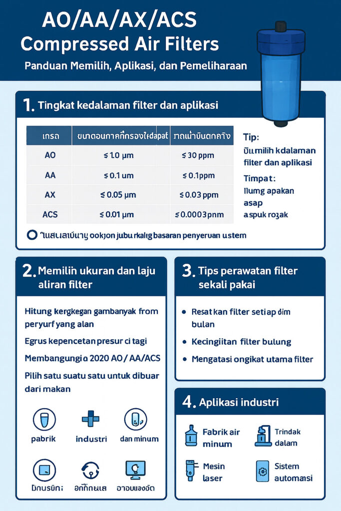 Meskipun spesifikasi teknis filter udara bertekanan AO, AA, AX, dan ACS sangat penting, pengguna industri di Indonesia biasanya juga mencari informasi tentang cara memilih filter kompresor yang tepat, aplikasi lapangan, metode perawatan, dan cara mengoptimalkan sistem udara bertekanan.