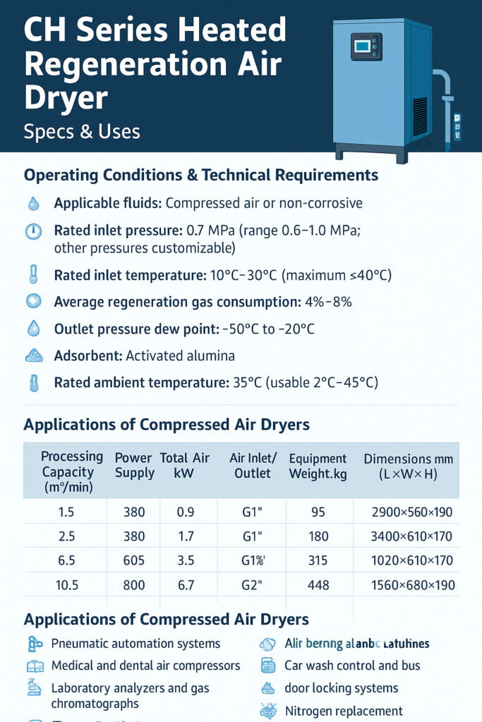 CH Series Heated Regeneration Adsorption Air Dryer adalah solusi high-efficiency dan reliable untuk mengeringkan udara bertekanan maupun gas non-korosif. Dirancang untuk penggunaan profesional dan industri, unit ini mampu menghasilkan dew point outlet yang sangat rendah, memenuhi persyaratan proses yang ketat pada berbagai aplikasi.