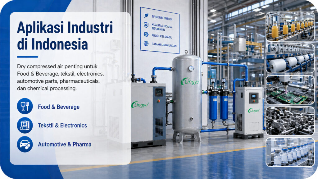 Banyak industri di Indonesia sangat bergantung pada reliable compressed air drying. Pada pabrik food and beverage, udara kering membantu menurunkan risiko kontaminasi dan mendukung proses packaging yang lebih bersih. Pada pharmaceutical manufacturing, kualitas udara yang stabil penting untuk menjaga konsistensi produk dan mendukung persyaratan proses yang ketat. Pada produksi elektronik, kontrol kelembapan membantu melindungi komponen sensitif dan peralatan presisi. Kemenperin secara konsisten menempatkan makanan dan minuman, tekstil, otomotif, elektronik, kimia, dan farmasi sebagai sektor prioritas industri nasional, sehingga kebutuhan terhadap dry compressed air pada sektor-sektor ini juga sangat relevan.