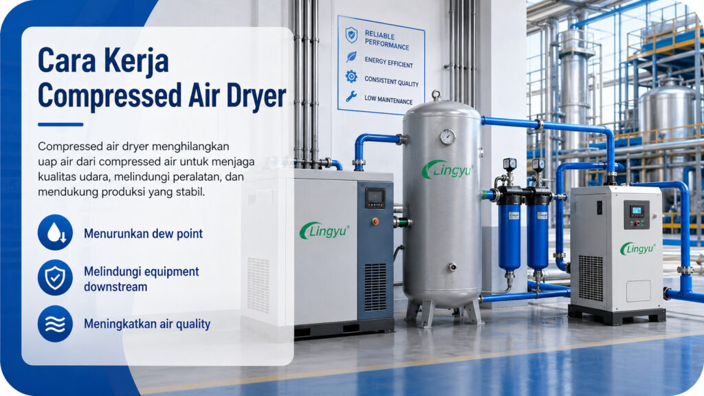 Prinsip dasar dari compressed air dryer working sangat sederhana: menghilangkan kelembapan dari compressed air sebelum kelembapan tersebut merusak sistem atau mengganggu produksi. Metode spesifiknya bergantung pada jenis dryer, tetapi semua dryer dirancang untuk memisahkan atau menyerap water vapor sehingga udara keluar menjadi jauh lebih kering dibanding udara masuk.