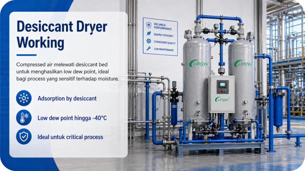 Desiccant compressed air dryer menggunakan adsorption alih-alih pendinginan. Dalam sistem ini, compressed air melewati vessel berisi desiccant material seperti activated alumina, silica gel, atau molecular sieve. Desiccant tersebut menangkap kelembapan dari compressed air dan menghasilkan much lower dew point dibandingkan refrigerated dryer.