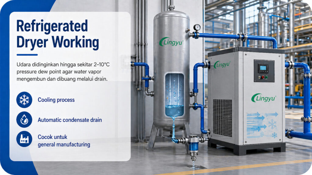 Refrigerated compressed air dryer bekerja dengan cara mendinginkan compressed air ke suhu rendah, biasanya sekitar 2°C hingga 10°C pressure dew point. Saat udara mendingin, water vapor mengembun menjadi air cair. Kondensat ini kemudian dipisahkan dan dibuang melalui automatic drain.