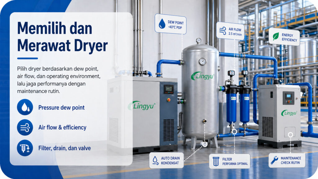 Memilih dryer yang tepat bergantung pada beberapa faktor. Faktor pertama adalah required pressure dew point. Jika aplikasi hanya membutuhkan general-purpose dry air, refrigerated dryer mungkin sudah cukup. Jika proses sensitif terhadap kelembapan atau beroperasi dalam kondisi dingin, desiccant dryer bisa menjadi pilihan yang lebih baik.