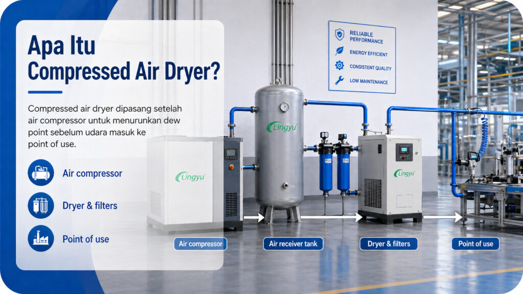 Compressed air dryer adalah perangkat yang dipasang dalam compressed air system untuk menghilangkan kelembapan dari udara setelah proses kompresi. Perangkat ini biasanya ditempatkan di bagian downstream dari air compressor dan upstream dari titik penggunaan. Dalam banyak sistem, dryer bekerja bersama filters, separators, storage tanks, dan drains untuk meningkatkan kualitas udara secara keseluruhan.