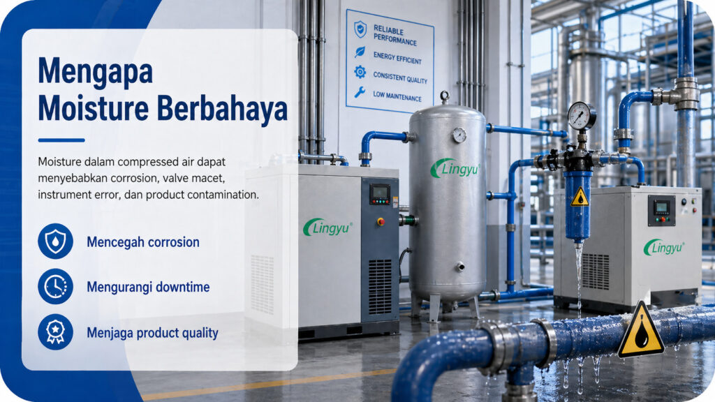 Masalah umum akibat wet compressed air meliputi corrosion pada pipeline, kerusakan pada pneumatic tools, valve yang macet, kegagalan instrument, kontaminasi di area produksi, dan bahkan pembekuan jalur udara pada kondisi suhu rendah. Dalam konteks Indonesia, risiko ini menjadi lebih relevan di pabrik makanan dan minuman, tekstil, elektronik, kimia, dan farmasi, karena sektor-sektor tersebut termasuk sektor prioritas dan sangat bergantung pada stabilitas kualitas udara proses.