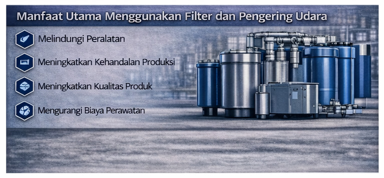 Salah satu keunggulan utama dari compressed air filters and dryers adalah perlindungan peralatan. Clean and dry compressed air membantu mengurangi karat, korosi, keausan internal, dan kontaminasi pada valve, cylinder, pneumatic tools, serta komponen sistem lainnya.