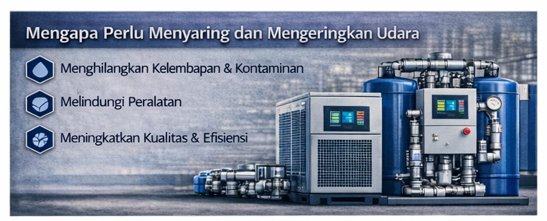 Compressed air dryers digunakan untuk menghilangkan kelembapan dari compressed air. Karena udara atmosfer secara alami mengandung uap air, proses kompresi akan meningkatkan konsentrasi kelembapan tersebut. Ketika compressed air mendingin, uap air akan mengembun menjadi air cair. Jika kelembapan ini tidak dihilangkan, hal itu dapat menyebabkan korosi, kerusakan peralatan, kualitas produk yang buruk, dan performa sistem yang tidak stabil.