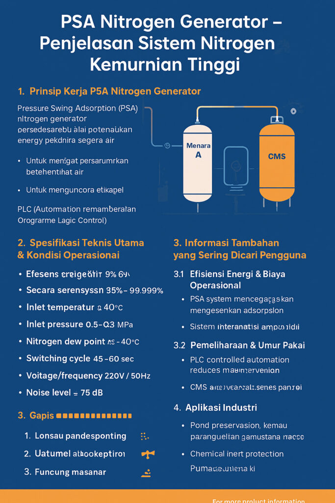 Nitrogen merupakan gas inert penting yang banyak digunakan dalam industri seperti elektronik, pengemasan makanan, farmasi, produksi kimia, serta pemrosesan logam. Bagi pengguna yang membutuhkan nitrogen berkualitas tinggi, memahami prinsip kerja, parameter teknis, serta aplikasinya sangatlah penting. Artikel ini menjelaskan secara lengkap seri LYZD-A PSA Nitrogen Generator, membantu Anda memilih sistem yang paling sesuai.