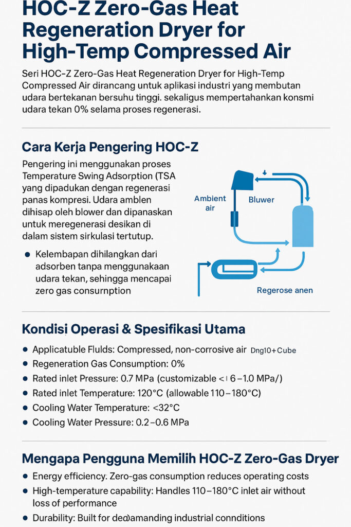 Seri HOC-Z Zero-Gas Heat Regeneration Dryer for High-Temp Compressed Air dirancang untuk aplikasi industri yang membutuhkan udara bertekanan bersuhu tinggi, sekaligus mempertahankan konsumsi udara tekan 0% selama proses regenerasi. Dengan teknologi regenerasi panas kompresi yang canggih, unit ini mampu menyediakan udara kering, stabil, dan hemat energi untuk berbagai proses industri yang berat.