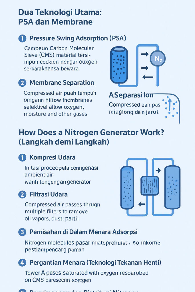 Generator nitrogen modern biasanya menggunakan salah satu dari dua teknologi inti berikut: