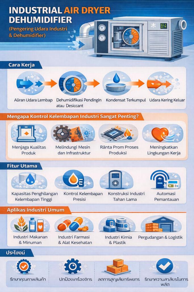 Industrial air dryer dehumidifier (pengering udara industri & dehumidifier) merupakan solusi penting bagi industri yang membutuhkan kontrol kelembapan yang stabil dan akurat. Dengan menghilangkan kelembapan berlebih dari udara, sistem ini membantu melindungi produk, peralatan, dan proses produksi sekaligus meningkatkan efisiensi operasional secara keseluruhan.
