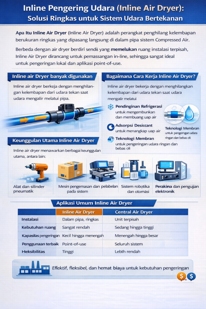 Inline air dryer bukan pengganti air dryer industri berskala besar, tetapi merupakan solusi tambahan yang sangat efektif untuk kebutuhan pengeringan lokal.