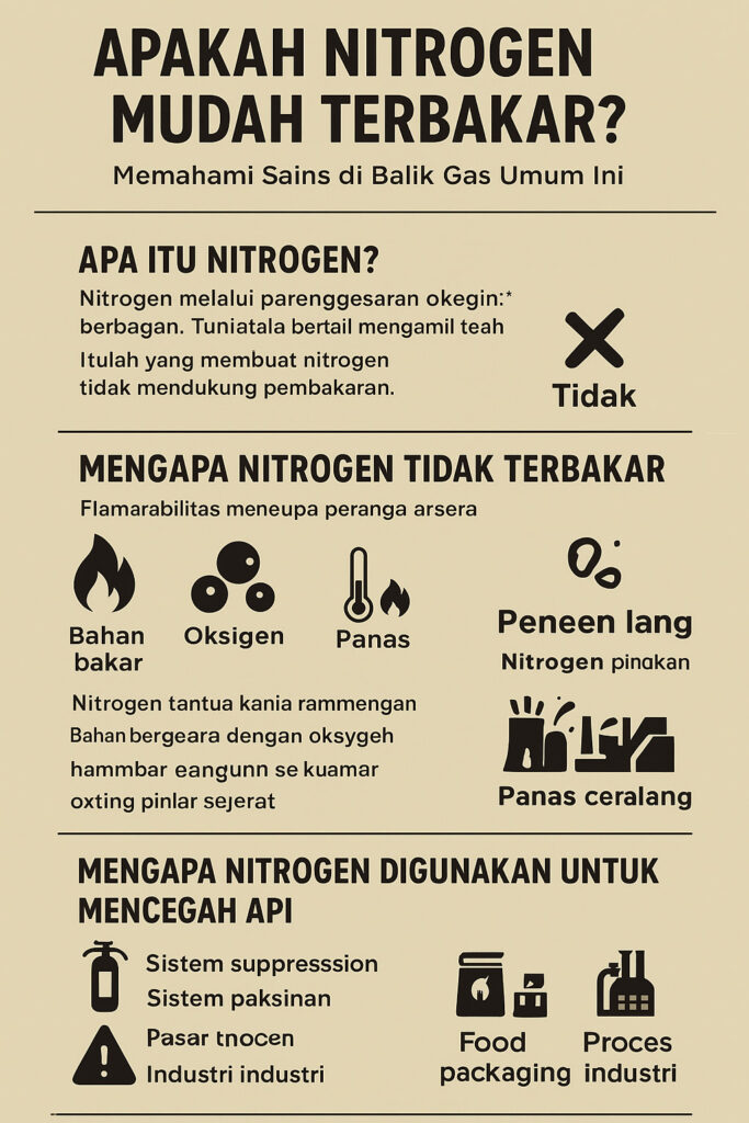| Nitrogen bisa terbakar pada suhu tinggi. | Salah — nitrogen tidak terbakar pada suhu berapa pun. |