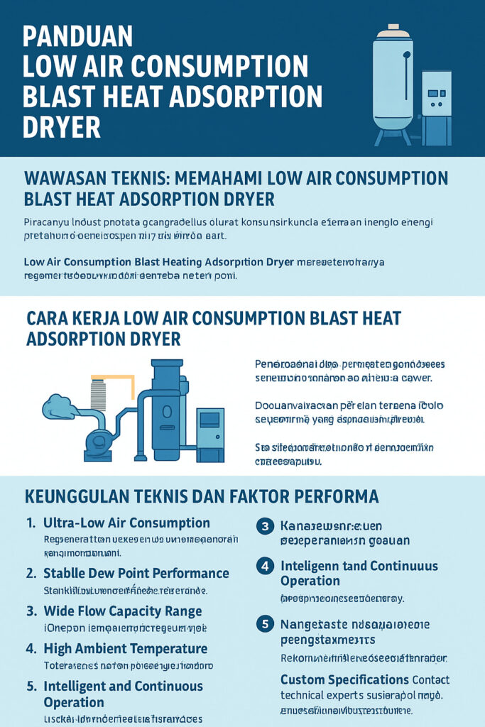 Low Air Consumption Blast Heating Regeneration Adsorption Dryer menawarkan udara sangat kering dengan konsumsi energi rendah dan hampir tanpa penggunaan udara tekan. Sistem regenerasi tertutup, kontrol cerdas, dan rentang kapasitas luas menjadikannya pilihan ideal untuk aplikasi industri, laboratorium, dan medis yang membutuhkan kontrol kelembapan yang presisi dan andal.