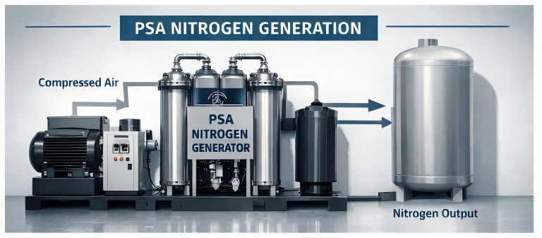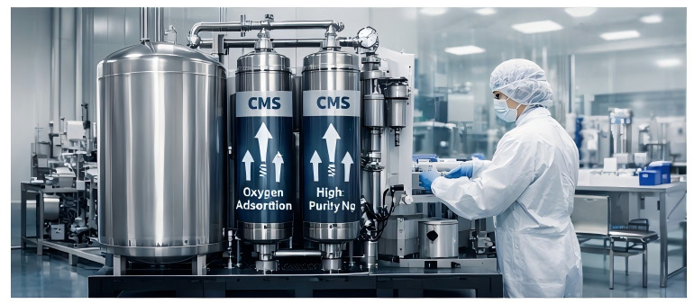 Teknologi PSA nitrogen generator menggunakan carbon molecular sieve (CMS) untuk menyerap molekul oksigen dari udara bertekanan. Proses ini memungkinkan nitrogen melewati sistem sebagai gas produk dengan tingkat kemurnian sangat tinggi, bahkan hingga 99.999% purity.