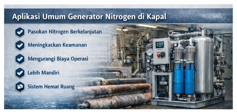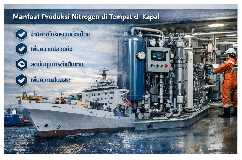 Nitrogen banyak digunakan di atas kapal untuk tank inerting, pencegahan kebakaran, pipeline purging, menjaga tekanan, dan melindungi peralatan sensitif maupun material yang disimpan. Secara tradisional, nitrogen dapat dipasok melalui tabung atau pengiriman liquid nitrogen, tetapi metode ini sering kali kurang praktis di lingkungan maritim karena keterbatasan penyimpanan, ketergantungan pada pasokan eksternal, dan ketidaknyamanan operasional.