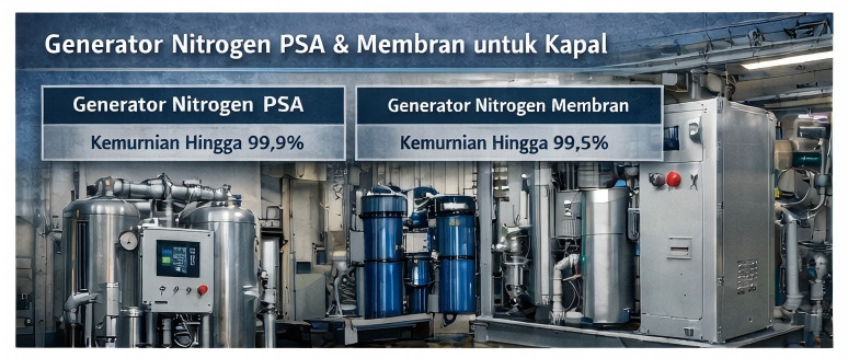 Pilihan antara teknologi PSA dan membrane bergantung pada kebutuhan nitrogen purity kapal, ruang instalasi yang tersedia, kondisi operasi, dan tujuan aplikasinya.