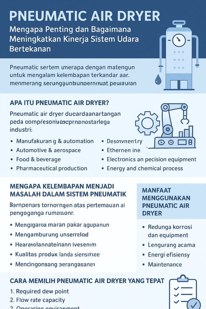Artikel ini menjelaskan apa itu pneumatic air dryer, cara kerjanya, manfaat utamanya, serta cara memilih model terbaik untuk kebutuhan Anda.