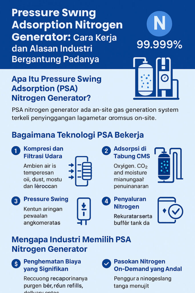 Seiring meningkatnya kebutuhan industri akan nitrogen berkemurnian tinggi dengan biaya operasional rendah, Pressure Swing Adsorption Nitrogen Generator menjadi salah satu solusi yang paling banyak digunakan. Tanpa perlu bergantung pada pasokan nitrogen curah atau sewa tabung yang mahal, perusahaan kini dapat memproduksi nitrogen secara on-site, sesuai permintaan, dengan efisiensi optimal.