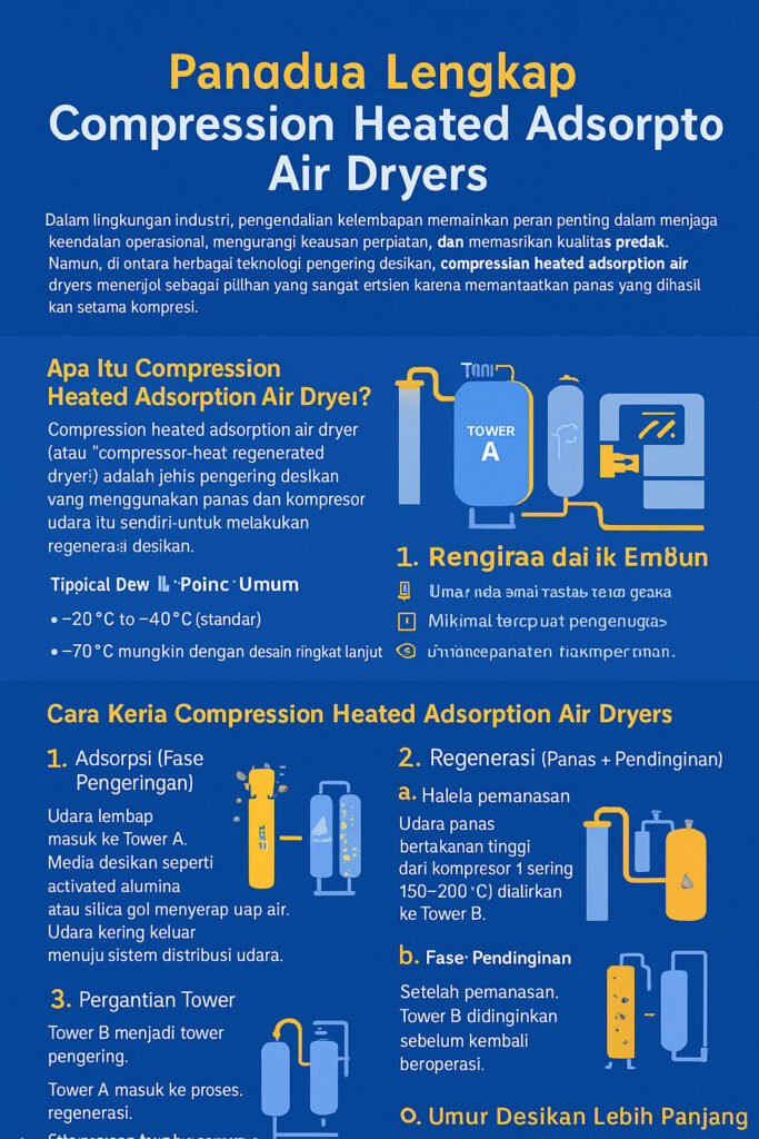 Compression Heated Adsorption Air Dryers adalah salah satu metode paling efisien, ramah lingkungan, dan andal untuk menghasilkan udara bertekanan ultra-kering. Dengan memanfaatkan panas yang sudah tersedia dari kompresor, sistem ini memberikan penghematan energi besar sambil mempertahankan performa titik embun yang sangat rendah.