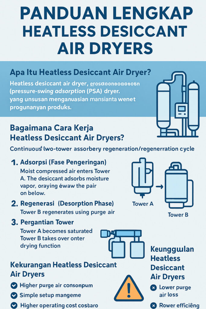 Panduan lengkap ini menjelaskan cara kerja heatless desiccant dryer, manfaatnya, keterbatasan, aplikasinya, serta pertimbangan penting saat memilih sistem yang tepat untuk kebutuhan operasional Anda.