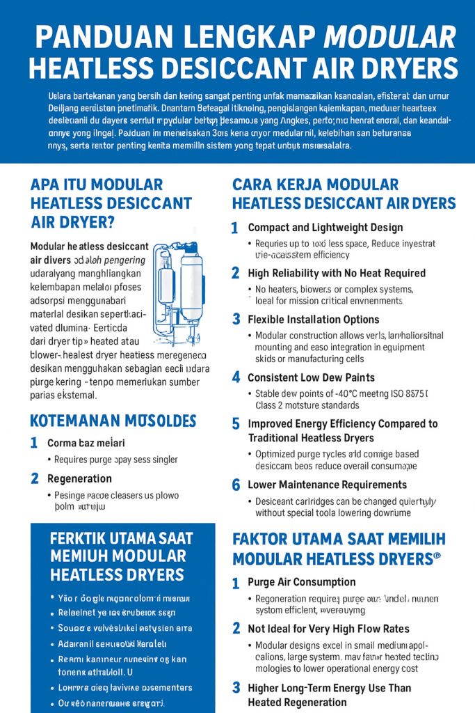 Modular Heatless Desiccant Air Dryers adalah pengering udara yang menghilangkan kelembapan melalui proses adsorpsi menggunakan material desikan seperti activated alumina. Berbeda dari dryer tipe heated atau blower-heated, dryer heatless meregenerasi desikan menggunakan sebagian kecil udara purge kering—tanpa memerlukan sumber panas eksternal.