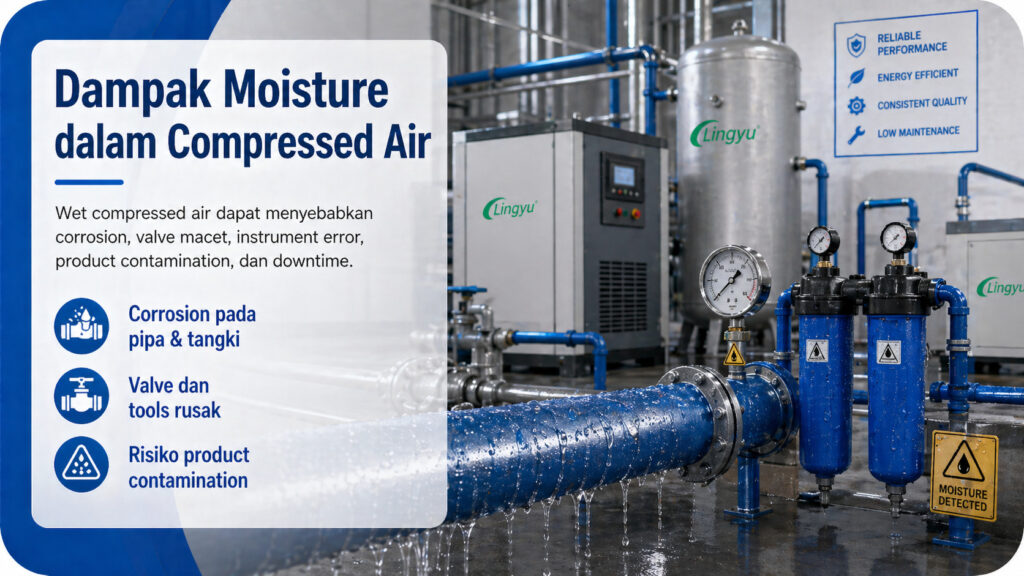 Wet compressed air dapat menyebabkan internal corrosion pada pipa, tangki, dan fitting. Moisture juga dapat merusak valve, cylinder, pneumatic tools, dan precision instruments. Pada automated systems, kelembapan dapat memicu performa kontrol yang tidak stabil atau membuat komponen menjadi macet. Pada lingkungan yang lebih dingin, moisture bahkan bisa membeku di dalam pipa dan menghambat aliran udara.