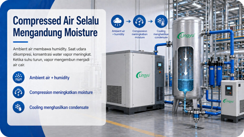 Udara atmosfer tidak pernah benar-benar kering. Selalu ada sejumlah water vapor di dalamnya, dan jumlah tersebut dipengaruhi oleh suhu, humidity, serta lingkungan sekitar. Ketika air compressor menarik ambient air, compressor juga ikut menarik kelembapan tersebut.