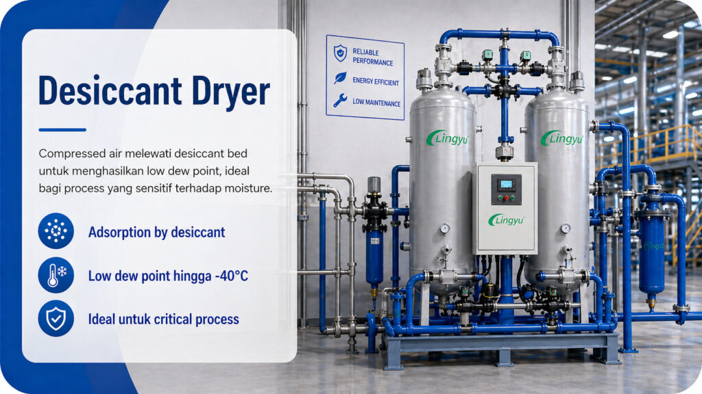 Desiccant dryer menghilangkan moisture melalui proses adsorption. Compressed air melewati material desiccant seperti activated alumina atau molecular sieve, yang menangkap water vapor dari udara. Dryer jenis ini dapat mencapai very low pressure dew point, seperti -40°C atau bahkan lebih rendah.