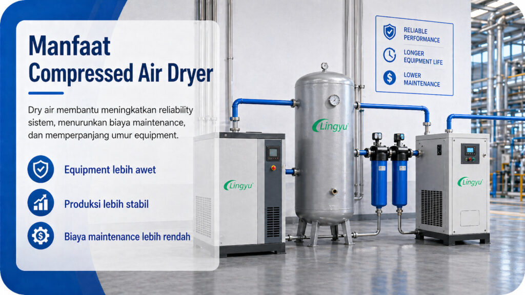 Kedua, dryer meningkatkan keandalan produksi. Moisture-free air memungkinkan automation systems dan instrument bekerja lebih konsisten. Hal ini sangat penting pada precision manufacturing dan continuous production lines.