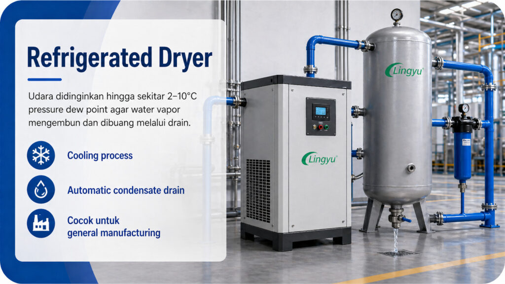 Jenis dryer ini banyak digunakan karena efisien, andal, dan ekonomis untuk berbagai lingkungan pabrik. Di Indonesia, refrigerated dryer sering menjadi pilihan yang sangat praktis untuk food packaging, pabrik minuman, workshop otomotif, pabrik tekstil, lini manufaktur umum, dan banyak aplikasi lain yang tidak membutuhkan extremely low dew point.