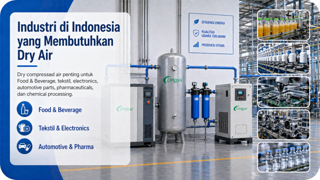 Dalam industri Food & Beverage, dry air membantu menjaga proses packaging dan produksi tetap lebih bersih. Dalam pharmaceutical manufacturing, pasokan reliable dry air membantu mendukung process control dan quality assurance. Dalam produksi electronics, moisture dapat merusak komponen sensitif dan menurunkan presisi manufaktur.