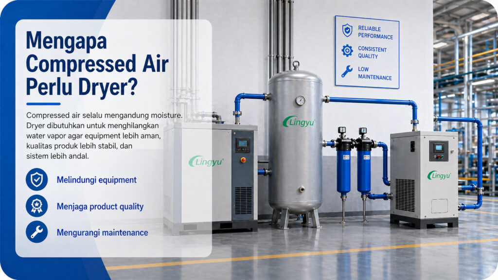 Dalam praktiknya, hampir semua industrial compressed air systems membutuhkan dryer. Keputusan yang sebenarnya bukan apakah sistem perlu drying, tetapi jenis dryer apa yang paling sesuai.
