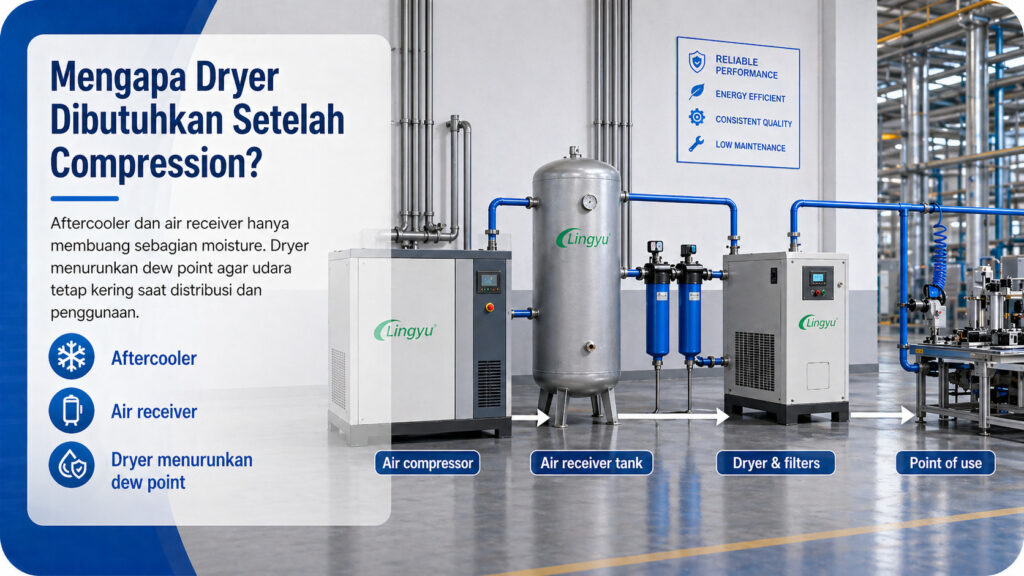 Dryer dibutuhkan karena fungsinya adalah menurunkan dew point dari compressed air. Dew point adalah suhu ketika water vapor mulai mengembun menjadi air cair. Ketika dew point diturunkan, udara akan tetap lebih kering selama penyimpanan, distribusi, dan penggunaan. Hal ini melindungi equipment downstream dan mendukung operasi yang lebih stabil.
